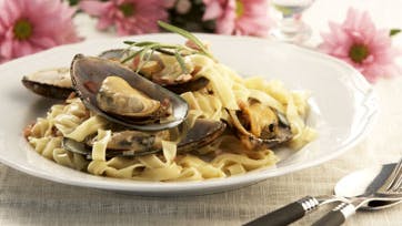 Friske blåmuslinger, pasta og hvidvin i skøn forening. Få opskriften fra Familie Journal her.
