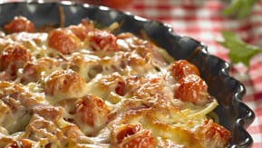 Kog spaghettien i saltet vand efter posens anvisning. Skær peberfrugterne i strimler. Kog dem med i pastaen de sidste 2 min. Hæld det hele i en sigte og skyl med koldt vand. Smør et ildfast fad med smør. Fordel pasta og peberfrugt i fadet og læg skinken på. Halver tomaterne og læg dem oven på skinken. Pisk æg, mælk, snittet oregano og purløg sammen. Hæld blandingen over og drys ost på. Sæt fadet midt i ovnen ved 200° ca. 25 min.