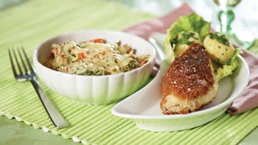 Løft skindet lidt fra kyllingekødet. Smør pesto på kødet og læg skindet tilbage. Krydr med salt og peber og vend brystet i mel eller rasp. Steg det i olie/smør ved jævn til svag varme ca. 15 min.