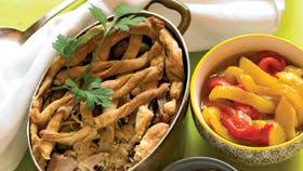 Kom kylling i et ovnfast fad, drys med salt og peber og kom ½ dl vand i bunden. Steg kyllingen i en time ved 180°. Gør imens resten i stand og skær skinken i mindre stykker. Bland alle ingredienserne og stil dem på køl. Smør en lille pie-form og fór den med 2/3 af dejen. Pluk kyllingekødet af den færdige kylling og bland i resten, der lægges i den forede form. Hæld skyen fra kyllingen ved og læg låg af flettet eller mønstret dej over. Luk til og bag ved 190° i ca. 45-50 min., til dejen er sprød og lysebrun. Afkøl og server helt kold.