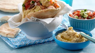 Blend kikærterne med brød i tern, hvidløg, olivenolie, limesaft, spidskommen og tahin til en grynet masse og smag hummussen til med salt og peber. Fjern kernerne fra tomater og agurk og skær dem i små tern. Bland ternene med løg, persille, olivenolie, limesaft og smag til med salt og peber. Lun pitabrødene og fyld dem med hummus, grønsagstern og laks i flager.
