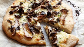 Rør gær og vand sammen og tilsæt olie, salt og pizzamel i den mængde, at dejen kan klare det. Ælt dejen godt og lad den hæve mindst 20 min., men gerne en time eller to. Skær svampene i passende stykker og steg dem lidt ad gangen i olie. Drys med salt og peber og skru ned, når de har taget farve, tilsæt hvidløg og timian. Steg i 10 min. Skær mozzarellaen i skiver. Rul dejen ud til fire cirkler. Fordel osten på dejen, kom svampene over og drys med timian og olie. Bag pizzaerne ved 210° i 15-20 min. Server med grøn salat til.
