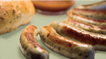 Hak bacon og løg i kødhakker eller blender og bland det med kødet. Tilsæt citronskal, hvidløg, finthakket timian, salt og peber sammen med ægget. Bland melet i farsen skiftevis med mælken og rør farsen godt igennem. Læg tarmen i vand og lad den bløde op. Kom farsen i en sprøjtepose og fyld farsen i tarmene, der lukkes af til små pølser. Prik pølserne med en gaffel og steg dem i smørret ved jævn varme 6 min. på hver side.