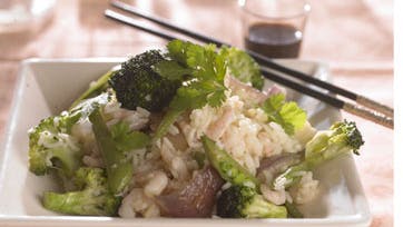 (4 pers.)15 min1 spsk. olivenolie el. risolie1 rødløg i tynde både200 g sukkersnaps (tykke ærter)250 g broccolibuketter3 fed hvidløg i skiver2 spsk.