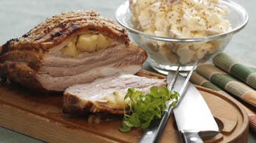 Gnid salt i stegens riller og stil den i ovnen ved 200° i ½ time. Skræl æblerne og kom halvdelen i en gryde med halvdelen af citronsaften og kog til en mos. Skær langs fedtet under sværen og læg æblemosen herind. Kom laurbær, nelliker og stykker af citronskal i sværen. Stil den i ovnen igen i 1½ -2 timer, til den er gennemstegt. Pisk fløden til let skum og smag til med salt og peber. Kom resten af æblerne i sammen med peberrod, sennepsfrø og høvlet kinaradisse. Smag til med salt og peber. Server til ribbensstegen med kogte kartofler og brøndkarsesalat.