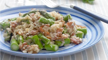 Skær bacon i små tern og svits dem let i olien. Tilsæt løg og ris og lad dem svitse med uden de tager farve. Tilsæt hvidvin og lad risen opsuge væden. Skær aspargesene i mindre stykker og tilsæt bouillonen 1 dl ad gangen. Tilsæt aspargesene sammen med den sidste dl bouillon og lad risottoen småsimre til konsistensen er som en lind grød. Vend parmesanen i, smag til med salt og peber og server risottoen drysset med revet parmesan sammen med et godt stykke brød.