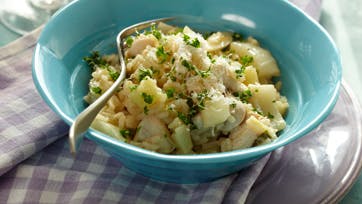 Skær kyllingen i mindre stykker. Vask fenniklen og skær den i mundrette stk. Sautér kylling, løg og ris i olien, uden de tager farve. Tilsæt hvidvin og fennikel og lad risen opsuge væden, mens der røres. Tilsæt bouillonen lidt ad gangen, til det hele er opsuget. Vend parmesanen i, smag til med salt og peber og servér evt. med et par skiver godt brød.