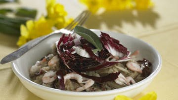 Steg svampene i olien, til de er let brunede. Tilsæt løg, hvidløg, salvie og ris og steg i 2 min. Kom så vin og ca. 2 dl suppe ved og skru ned. Så er kunsten at tilsætte ca. 1-2 dl suppe ca. hvert 5. minut, til risene er mættede med suppe. Når den er tæt på færdig, kommes rejer og krydderurter ved, radicchioen snittes fint og halvdelen tilsættes og røres med, mens resten pyntes på den færdige risotto. Server med reven parmesan og et godt glas rødvin.