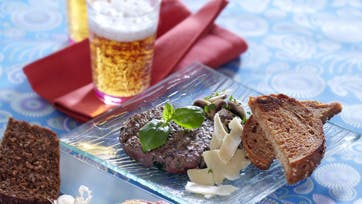 Ælt kødet med olivenolie, citronsaft, mynte, persille, salt og peber. Form kødet til 4, store, flade bøffer og hak dem godt sammen med kniven. Sæt dem i køleskab, hvis de ikke skal på panden med det samme. Rens svampene og skær dem i skiver. Marinér dem i olie, citronsaft, salt og peber en times tid. Steg tataren på grillpande eller slip let-pande uden fedtstof. Stegetiden afhænger af, hvor rød tataren må være, men 2 min. på hver side ved god varme vil sikkert passe. Rist brødet sprødt i olie på panden og anret bøffer, brødet og svampe. Drys flager af parmesan over og pynt med basilikum.