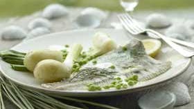 Læg fiskene i et smurt ildfast fad og kom smør, salt, peber, dild og citronsaft over. Skrab kartoflerne og kog dem 20 min. med salt. Flæk rødløg i kvarter og læg ved fisken og stil dem i ovnen ved 200° i 10 min. Bælg ærterne. Bland dem med fløden og den revne citronskal og hæld over fisken, der stilles i ovnen igen i 20 sek. Server på benet med grønsager og sky til de nye kartofler.
