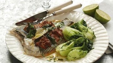 20 min.(1 pers.)1 stor flået rødspætte1 spsk. rød pesto2 skiver citron20 g smørPersillle2 bok choi (kinesisk kål) i minimål1 spsk. olivenolieHakket