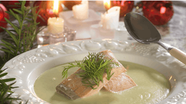 Kog vand, salt, sukker og peberkorn op og lad lagen afkøle lidt. Læg laksefileten i saltlagen og lad trække i 20 min. på køl. Rens romanescoen og porren, skræl kartoflerne og skær grønsagerne i grove stykker. Sauter stykkerne i olien, tilsæt bouillonen og lad det simre under låg i 15 min. Tilsæt fløde og lad det simre yderligere 5 min. Skær laksen i 8 stykker og damp dem i 6 min. Blend suppen og smag til med salt og peber. Server suppen med laksestykkerne og klippet dild i.