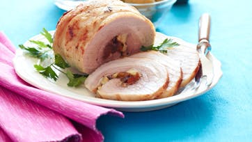 Bred kødstykket ud og drys med salt og peber. Bland hakkede, tørrede abrikoser med æbler, persille, laurbær og timian. Rul stegen stramt og snør. Smelt smørret i en tykbundet gryde og brun stegen på begge sider.