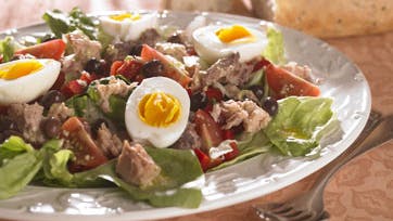 Pluk og skyl salaten, skær tomater i både. Kog æg, og halver, skær peberfrugter i tern, og bælg ærterne. Vend det hele i en skål med tun. Hak ansjoserne fint, og pisk dem med citronsaft, sennep, olie, kapers, salt og peber. Kom det over salaten, og pynt med oliven. Server med brød og vin.