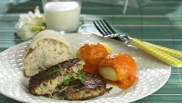 Bland selleri, ost, hvidløg, æg, mælk, rasp, salt og peber til en sammenhængende fars. Form 4 bøffer af farsen og steg dem gyldne i lidt olie, 5 min. på hver side. Hak løg og peberfrugter fint. Svits løget i olien i 2 min., tilsæt peberfrugter, vand og cayennepeber og lad det simre unde låg i 5 min. Blend sovsen med en stavblender og smag til med salt og peber. Server med kogte kartofler og brød.