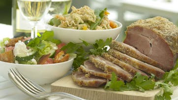Læg kødet i en gryde og hæld vand ved, så det lige dækker. Bringes i kog og tilsættes timian og peberkorn. Kog kødet småt under låg 1 time. Køl kødet af i suppen så hurtigt som muligt. Tag det op og dup det tørt. Bland de to slag sennep og smør det på kødet. Drys rasp på. Sæt det i ovnen ved 225° 20-30 min., til raspen er gylden.