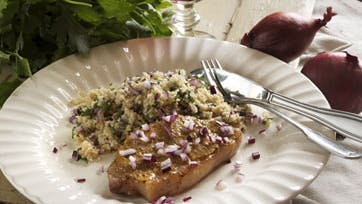 Gnid koteletten med salt og peber. Steg den på grillpande først ved høj varme i 2 min. på hver side og så ved lav varme i 5-6 min. på hver side, til den er netop gennemstegt. Smør den med sennep på hver side i et meget fint og tyndt lag. Overhæld couscous med kogende bouillon og lad det trække i 8 min. Bland det (uden væde) med løg, hakket persille, kapers, citronsaft og -skal og olivenolie. Smag til med salt og peber og server til koteletten.