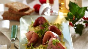 Hæld væden fra sildene og lad dem dryppe af på en køkkenrulle. Bland cremefraiche, mayonnaise og pickles og smag til med sennep, salt, peber og gurkemeje. Skær sildene i mindre stykker og anret dem med saucen. Drys karsen over som pynt.