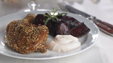 Skær 2-3 dybe snit i hvert kyllingelår. Bland mel, sesam, paprika og salt og vend kyllingelårene heri. Skræl rødbederne, halver dem og læg dem i et ovnfast fad. Hak hvidløgsfeddene groft og drys dem over rødbederne sammen med salt og peber. Fordel smørret i klatter over rødbederne og læg kyllingelårene på en bagerist over fadet, så kyllingesaften drypper ned ved rødbederne. Stil rødbeder og kylling i en forvarmet ovn ved 200° i 50 min. Server retten med lidt græsk yoghurt, rørt op med presset hvidløg, paprika, salt og peber.