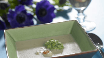 Hak løgene og svits dem i smørret, til de er blanke. Rør melet i og tilsæt bouillon lidt efter lidt, mens der røres. Tilsæt skaldyr og fl øde og lad suppen småsimre i 5 min. Blend ærter og dild til en ensartet mos og rør den med cremefraiche og yoghurt. Hæld fl øden i suppen og smag til med salt og peber. Server suppen med en skefuld ærtecreme i midten sammen med et stykke groft brød.