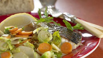 20 min.(2 pers.)1 stor gulerod1 mellemstor pastinak1 stort fed hvidløg8-10 rosenkål1 spsk. olie5-6 stænk TabascoSalt og peber300 g fiskefilet med