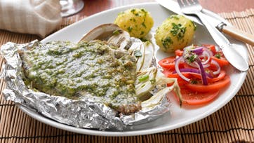 Vask fennikel, skær den i både og hak forårsløgene. Fordel fennikelbåde og forårsløg på to stykker stanniol og læg skrubberne over. Blend dild, olie, parmesan, pinjekerner og hvidløg til en jævn pesto og fordel den over skrubberne. Pak stanniolen sammen om fisken og bag dem ved 225° i 20 min. Åben pakkerne, giv dem yderligere 10 min. og server med kogte kartofler og tomatsalat.