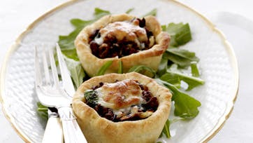Lav en dej af mayonnaise og mel med lidt salt. Pres dejen ud i to små muffinsforme. Forbag dem ved 200° i ca. 10 min., til dejen er let gylden. Varm en pande op med olie og start med at stege løg og hvidløg et par min., til det har taget farve. Kom kødet ved og steg til det er delt helt ud. Kom spinatbladene ved og steg til de lige er faldet sammen. Krydr med salt og peber. Fordel blandingen i de to forbagte bunde. Drys med revet ost og sæt dem tilbage i ovnen i yderligere et lille kvarter, til osten er smeltet og gylden. Server med en salat til.