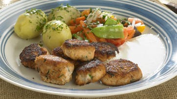 Skær laksen i mindre stykker og hak dem hurtigt sammen med salt i foodprocessor. Tilsæt æg, fløde, sennep og peber. Form farsen til små boller. Steg dem på pande i smør ca. 5 min. Bland yoghurten med peberrod og smag til med salt og peber. Server med kartofler og grønsagsblanding.