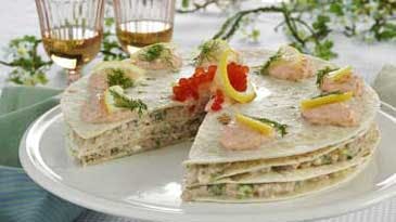 Hæld vandet fra tunen og hak de hårdkogte æg. Bland tun og æg med forårsløg, citronsaft, fromage frais, salt og peber og stil fyldet på køl. Blend lakseresterne med fromage frais og yoghurt til en ensartet creme og kom den i en sprøjtepose. Læg tortillaerne lagvist med tunfyldet og pynt med laksecreme, citron, dild og lakserogn. Server med en salat af blandede peberfrugter.