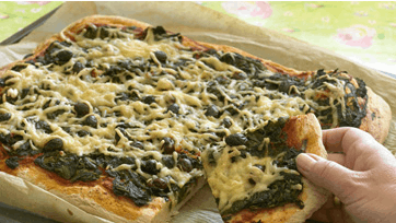 Rør gæren ud i vandet, tilsæt salt og olie og kom melet i, til dejen kan æltes glat og smidig på et bord. Hæv til ca. dobbelt størrelse. Steg hvidløg og pinjekerner i olie og tilsæt spinat. Dræn til al væde er væk og smag til med salt og peber. Rul dejen ud og smør tomatsovs på. Rul kanten op og kom spinaten over. Drys med oliven og revet ost og bag ved 225° i 12-15 min. Server med tomatsalat.
