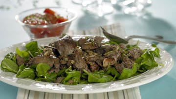 Skyl spinaten og lad den dryppe af. Steg leveren i olien med bacon i, til det er brunet godt. Skru ned og tilsæt hvidløg, ingefær, rosmarin og koriander. Steg videre, til det er stegt igennem, og kog så af med eddiken. Smag til med salt og peber og anret spinaten på to tallerkner med leveren over. Pynt med en citronbåd og giv groft brød og en tomatsalat til.