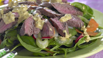 Krydr lammemørbraderne med salt og peber og brun dem på en tør pande ved høj varme i 3-4 min. Lad mørbraderne svale af, mens salaten tilberedes. Skyl spinaten og lad den dryppe godt af. Skær radiser, bladselleri og gulerod i tynde skiver og bland dem i spinaten. Rør en dressing af syrnet fløde, mayonnaise, karry, asie og kapers. Anret spinatsalaten på et fad, læg skiver af lammemørbrad over og hæld dressingen over.
