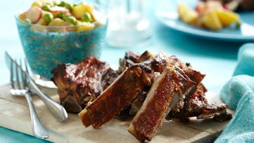 Del benene i passende stk. og kog dem i vand tilsat salt, peberkorn, laurbærblade og løg i 30 min. Kog kartoflerne i letsaltet vand, til de er møre. Rør sennep med citronsaft, vand, salt og peber og pisk olien i dråbevis, så dressingen tyknes. Skær de lune kartofler i tern, vend dem i dressingen og lad det køle lidt. Skær radiserne i skiver og vend dem i sammen med ærterne. Pisk olie, honning, tomatpuré og tabasco sammen til en marinade og smør den på de kogte ben. Steg benene færdige i ovnen ved 225° i 20 min. og servér.