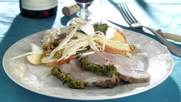 Gnid stegen med salt, peber og olie. Brun den i ovnen ved 200° i 15 min. Blend brød, persille, citron og sennep til en masse, der smøres på den lune steg. Steg videre i 20 min. til. Og læg så alufolie over, så overfladen ikke branker. Steg færdigt ca. 30 min. Sørg for at kartoflerne kommer ind undervejs, så de er færdige samtidig - skal have ca. 34-40 min. Bland mere olie med citronsaften af den revne citron og salt og peber. Skræl sellerien og skær den i tynde stænger med et juliennejern eller kniv. Vend i dressingen med tynde flager af æble samt valnødder og mynteblade. Drys til sidst med gedeost og server til kødet og kartoflerne.