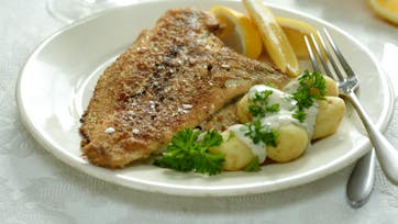 Vask kartoflerne og kog dem i letsaltet vand, til de er møre, ca. 20 min. Bland rugmelet med salt og peber og vend de flåede rødspætter heri. Varm stegepanden godt op og steg rødspætterne i smørret, til de er gyldne og sprøde, ca. 5 min. på hver sider. Smelt smørret i en gryde og rør melet i. Pisk mælken i lidt efter lidt, bring sovsen i kog under piskning og lad den småkoge i et par minutter. Tilsæt den hakkede persille og smag til med salt og peber. Server de sprødstegte rødspætter med kartofler, persillesovs og en god salat.