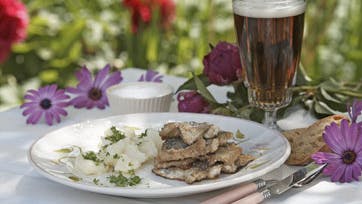 Kog kartoflerne i letsaltet vand. Skær hver filet i ca. 4 stykker. Bland rugmel, salt og peber, og vend stykkerne i blandingen. Steg stykkerne ved høj varme i ca. 2 min. på hver side, start med skindsiden. Pil kartoflerne og skær dem i skiver. Lav en opbagning af smør og mel og tilsæt mælken lidt efter lidt, mens der piskes godt. Kog stuvningen igennem, smag til med salt og peber og vend kartoffelskiverne i. Server med et drys af persille og groft brød.