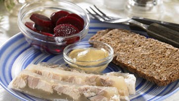 Skær sværen af og kog kødet i vandet blandet med eddike, salt, peberkorn, laurbærblade og løg, skåret i 4 dele. Kog ved svag varme i ca. 2 timer, til det er mørt. Tag kødet op, skær det i skiver og læg dem i et fad. Skum suppen, så det meste af fedtet og krydderierne fjernes. Udblød husblassen og kog suppen ind, til der er ca. 3 dl tilbage. Smelt husblassen i den varme suppe og smag til med salt og eddike. Hæld suppen over flæsket og stil fadet til afkøling i mindst 3 timer. Server med rugbrød, sennep og syltede rødbeder.
