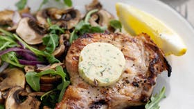 2 skiver ansjossmør ved siden af. Lad koteletterne hvile i ca. 5 min., før de serveres, så saften kan trække ind i kødet. Servér med salat.
