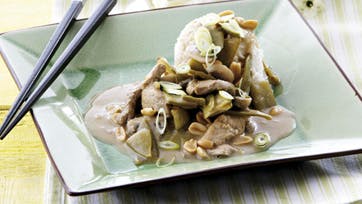 Svits kødstrimlerne i olien sammen med karrypasta og hakket chili. Snit sukkerærterne i mindre stykker, skær champignoner og citrongræs i skiver og lad dem svitse med i et par min. Tilsæt kokosmælk og oystersauce og lad det koge igennem i 5 min. Jævn retten med majsstivelse rørt ud i lidt vand og smag til med limesaft.