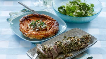 Afpuds din svinemørbrad og gnid den med olie, salt og peber. Brun din svinemørbrad på en varm pande 2 min. på hver side. Skyl og hak persillen. Hak hasselnødderne groft. Skræl og riv peberroden fint. Bland persille, nødder og