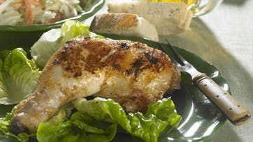 Skær 2-3 snit i kyllingelårene. Bland yoghurt, tandooripasta, olie og ingefær i en plastpose. Læg lårene i, masser dem lidt og mariner mindst 30 min., gerne fra morgen til aften i køleskabet. Tag lårene ud af posen og dup dem let. Varm olie på en pande og brun dem på begge sider. Steg dem ca. 30 min. ved svag varme til de er gennemstegte. Vend ofte. Server med salaten og godt brød.