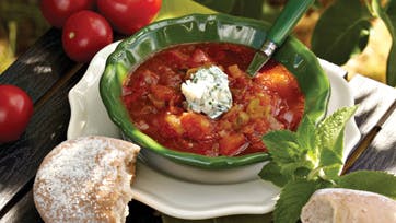 Skold og flå tomaterne og skær dem i mindre stykker. Pil og hak løgene og svits dem i en gryde i olien. Tilsæt tomaterne sammen med presset hvidløg. Bind krydderbuketten sammen og læg den i gryden. Hæld