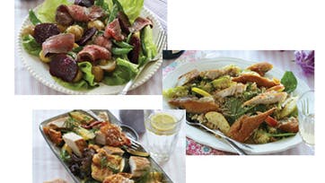Kog kartoflerne i ca. 15 min., til de er netop møre. Kog rødbeden i 30 min., til den mør. Skær kartoflerne i halve og rødbeden i skiver og vend dem med salt, peber og olie. Damp sukkerærterne i 30 sek. og vend dem i kartoffelblandingen. Steg kødet, så det er rosa i midten, og skær det i skiver. Pil løget og skær det i skiver. Vend begge dele i kartoffelblandingen. Anret blandingen på skyllede salatblade på et fad. Rør dressingen sammen og servér den til salaten.