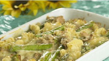 Kog pastaen efter anvisning på pakken. Smelt smørret, afbag med melet og spæd med mælken. Kog igennem og smag til. Tilsæt halvdelen af osten, asparges, pasta og tun. Kom i et smurt ovnfast fad og drys med resten af osten. Sættes i ovnen ved 225° i 15 min. Spises med grøn salat