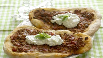 Ælt dejen sammen og lad den hæve 30 min. Rul den ud til én stor eller 2-3 mindre pizzaer. Steg løg, hvidløg og kød i olie og tilsæt tomater, citronskal, salt og peber og hæld kødsovsen over dejen. Bag ved 210° i 15 min. Rør yoghurt med agurk og mynte. Hæld sovsen over den varme pizza og server med grøn salat.
