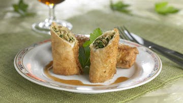 Skyl spinaten, lad den dryppe af i sigte og klip den i små stykker. Kog de hakkede gulerødder i lidt vand, til de næsten er møre. Kom nudlerne i vandet, lad det stå 1/2 min. over varmen og hæld det i sigte. Bland spinaten i, mens det er varmt, så den falder lidt sammen. Svits svampe, løg og hvidløg et par min. i olie, så svampevæden damper af. Bland alle ingredienserne og smag til med østerssauce, krydderier og salt. Form forårsrullerne og steg dem.