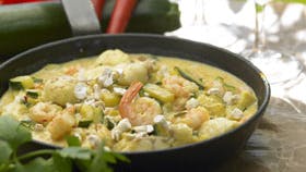 Tø hummerhaler eller rejer op, hvis de er frosne, og tryk dem fri for væde. Skær fiskekødet i store tern. Pil og hak løg og hvidløg. Rens chilien og skær den i små tern. Skær courgetten i små tern. Svits grønsagerne i 1 spsk. olie 4-5 min., til de er næsten møre. Tilsæt karrypasta eller karrypulver og svits det med. Tag grønsagerne af panden. Steg fisken i resten af olien ved god varme 2-3 min. Hæld kokosmælk ved og tilsæt grønsagerne. Kog lidt ind uden låg.