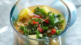 Hak løgene og svits dem sammen med kyllingekødet i olien. Skyl kålen godt, rib og hak den. Skræl kartoflerne og skær dem i tern. Kom grønkål og kartoffeltern ned til kødet sammen bouillonen. Tilsæt hvidløg, harissa, salt og peber og lad suppen koge under låg i 15 min. Smag suppen til og server med et godt stykke brød.