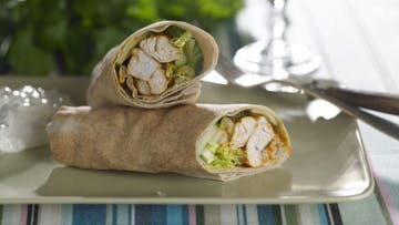 Vend kyllingestrimlerne i sovseblandingen og sæt dem i ovnen ved 200° i 10 min. Ordn alle grønsagerne Vend salaten sammen med kyllingen, fold det i de lunede brød og server med tzatziki.
