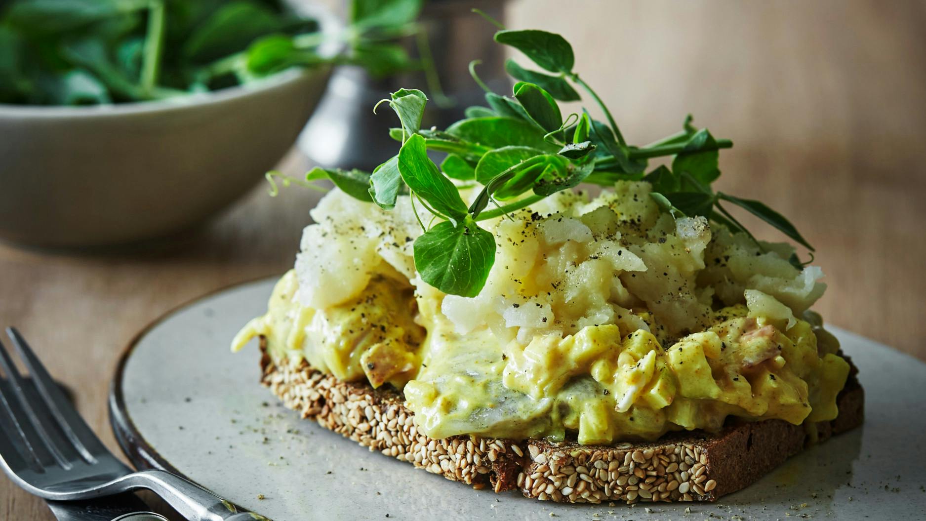Rør creme-fraiche og mayonnaise med karry og små æbletern. Bland rødløg i, og krydr med salt og peber.